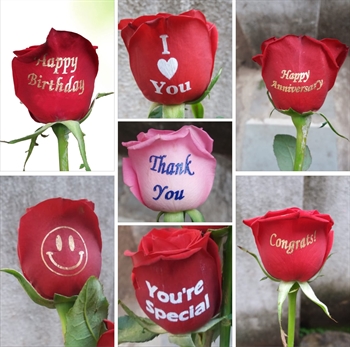 SINGLE PRINTED ROSE in sleeve. Your Choice of Messages: I Love You, You're Special, Smiley Icon, Happy Birthday, Happy Anniversary, Thank You, Congrats